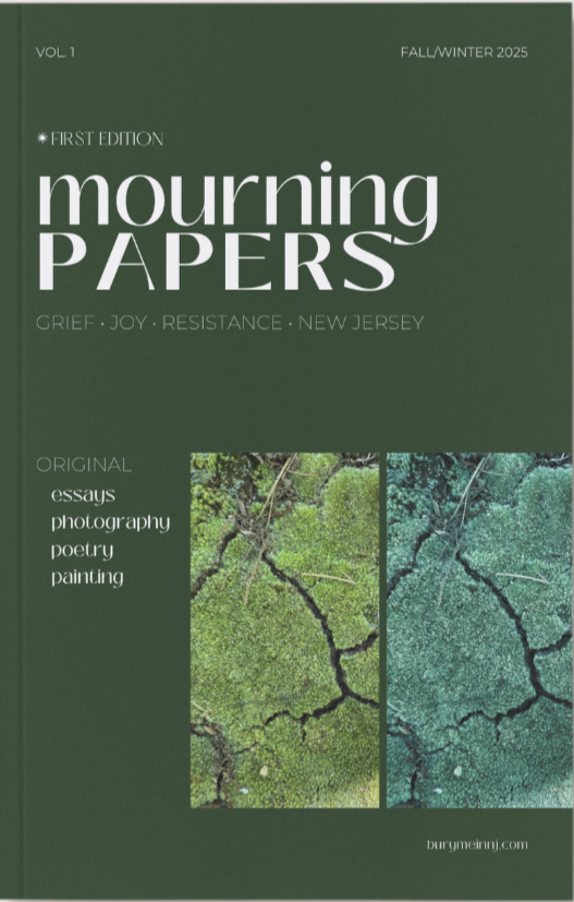 After years of holding space for grief, memory, and connection through the digital work of the Bury Me in NJ project, it felt like it was time to bring that energy into the physical world. We wanted to create something tangible, something that could carry the weight of what we’ve all been holding: the sorrow, the hope, and the calls to action for a more just, compassionate world. We started dreaming about what the Mourning Papers could be, feeling called by themes that have been central in our other work—grief, joy, resistance, and New Jersey—and leaning into a strong sense that there was much more to explore. And we knew the heart of this project would only reveal itself through collective contribution, so we put out a call.